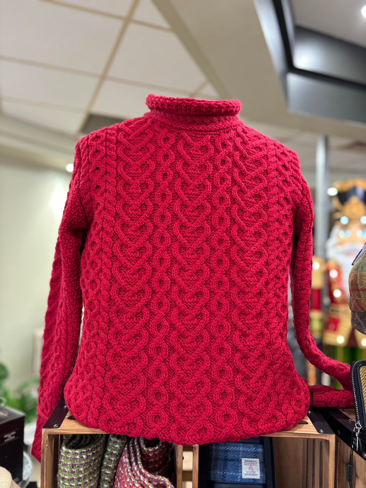 Our Luxurious Super Soft Polo Neck Aran contains a beautiful heart pattern through the body of the sweater, its design and super soft wool lends itself to cosiness and comfort. The perfect sweater for the season.