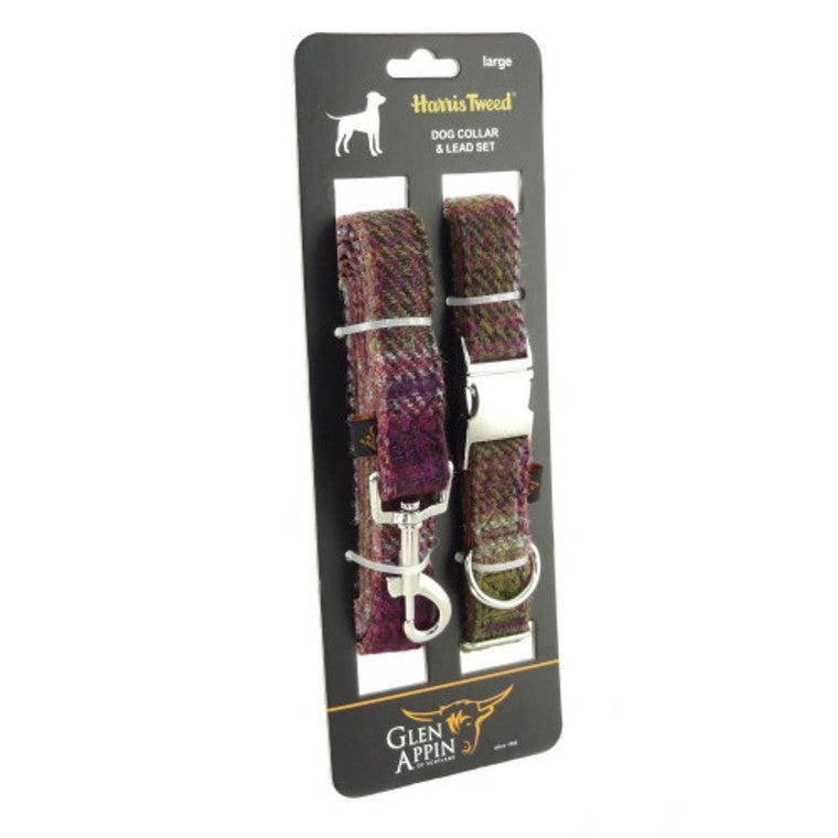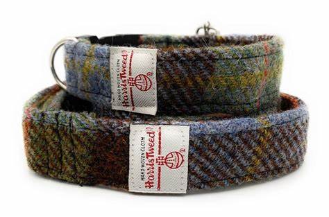 Tweed Dog collar with side release buckle and easy size adjustment. Classic clip to dog lead. Handwoven Harris Tweed to one side and soft, faux leather to back. Chrome metal fittings. Available in 4 Colors.