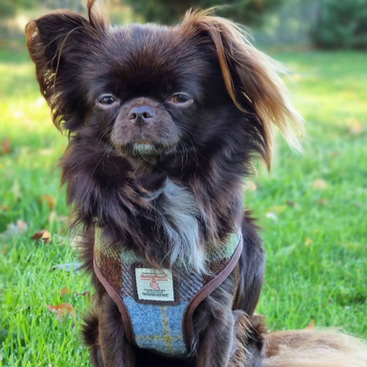 Fully adjustable dog harness with Harris Tweed outer, displaying the famous Harris Tweed label on the dog’s chest, and soft-feel polyester inner fabric. Lightweight straps and clips. Ring for dog leash attachment.