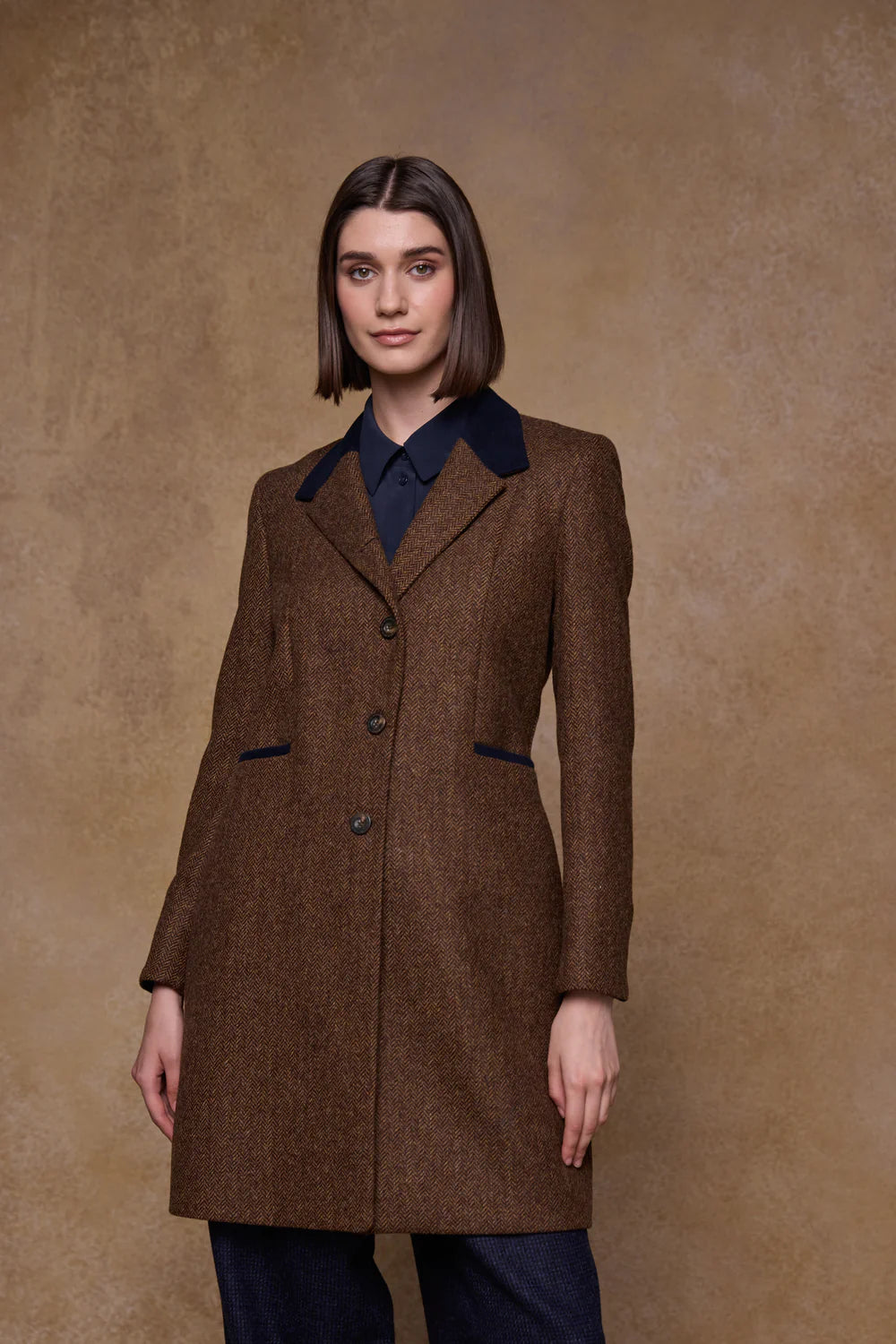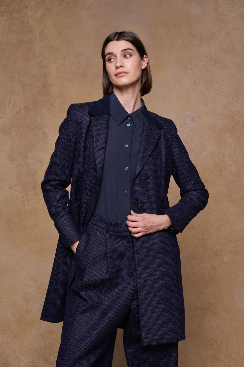 Elegant A-line design that flatters the feminine silhouette, nipped at the waist with princess seams and sophisticated detailing and a flattering curved front closing with 5 buttons.