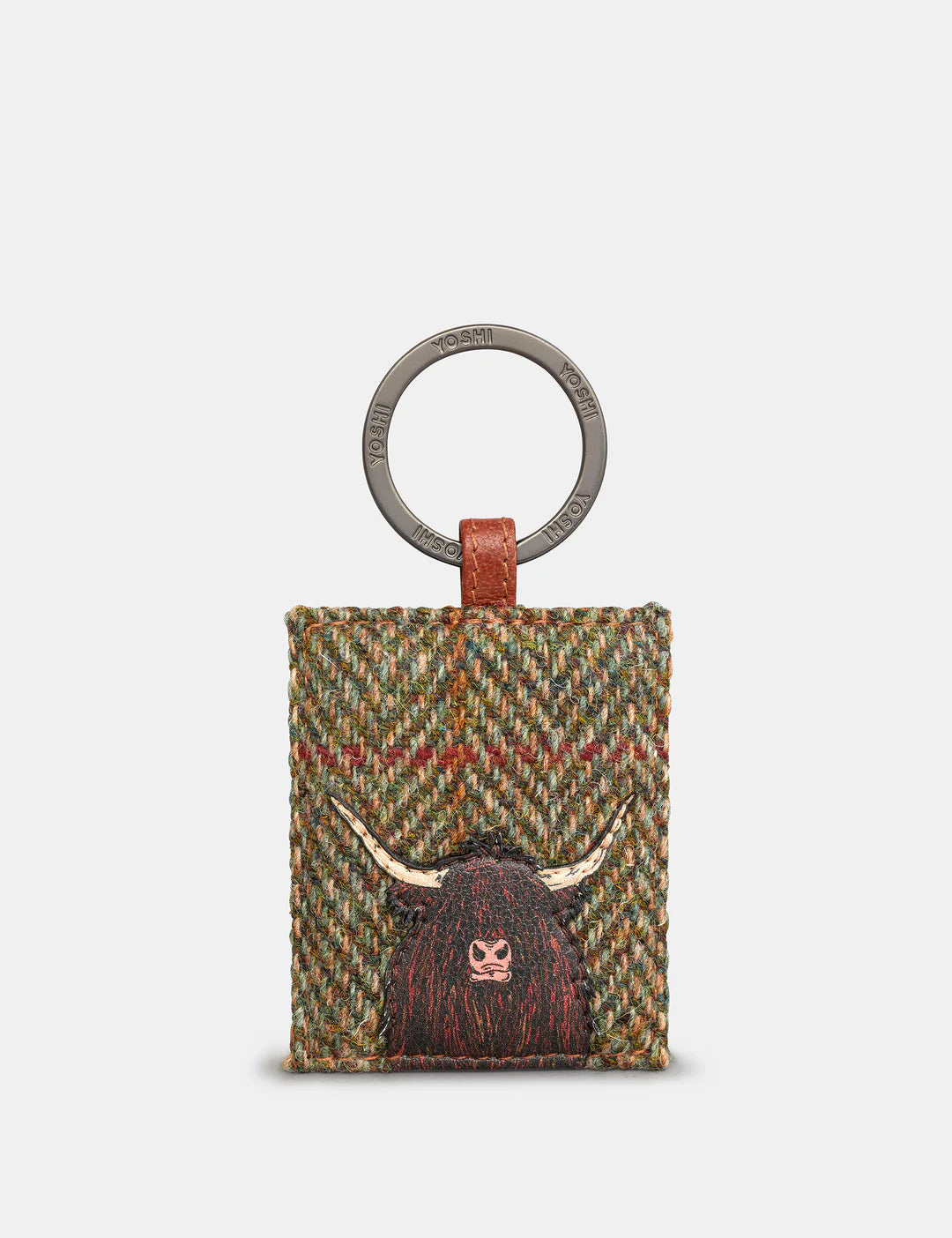 This Highland Cow keyring features a highland cow which sits against a Harris Tweed fabric and brown leather on the reverse and is the perfect way to store and carry your keys on its secure metal ring fitting.